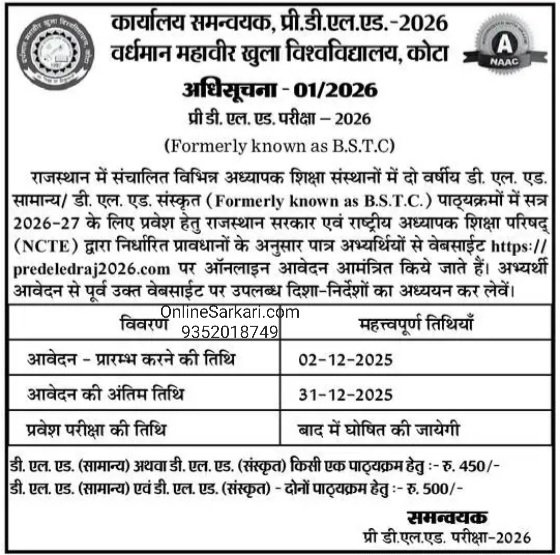 Vardhman Mahaveer Open University VMOU has released Rajasthan BSTC online form. Candidates who have passed 12th class can register for two-year Diploma in Elementary Education (D.El.Ed.) course. The BSTC exam serves as a gateway for individuals aiming to pursue a career in elementary education, ensuring they possess the necessary skills and knowledge to educate young minds effectively. All the candidates who have the required qualification for Rajasthan BSTC 2026 can click on the direct link given below by us to complete all the BSTC 2026 Online Form Registration process.